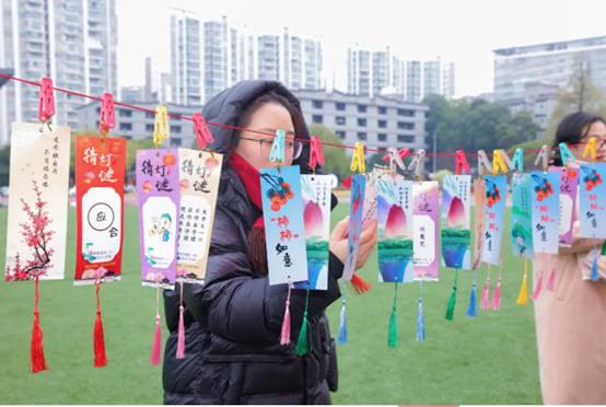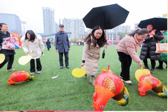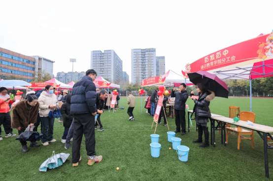 与此同时,17个趣味横生的游戏项目在游园区同步展开。“成职‘高尔夫’”重现古代捶丸运动,参与者手持球棒,专注击球,在三米开外感受别样运动乐趣;“套圈”区域,教职工们全神贯注,抛出手中的圈,试图套中心仪物品;“才高八斗迎新年”中,工作人员读出诗词上句,老师们迅速接龙,展现出深厚的文学功底;“赶鸡入笼”“丢沙包”“猜灯谜”“盲人摸福”等游戏也让现场笑声、欢呼声交织。