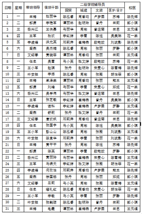 安全值班室设在行政楼监控室;医生值班室设在文旅学院实训酒店。