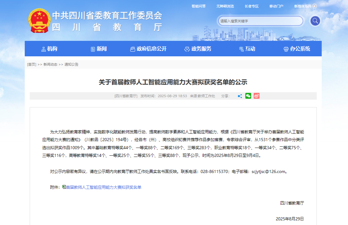 近期,四川省教育厅公布了四川省首届教师人工智能应用能力大赛获奖名单,我校教师凭借出色的专业能力与综合素养在大赛中获得一等奖1项、二等奖3项、三等奖2项,生动展现了我校教师良好的数字素养和人工智能应用能力。