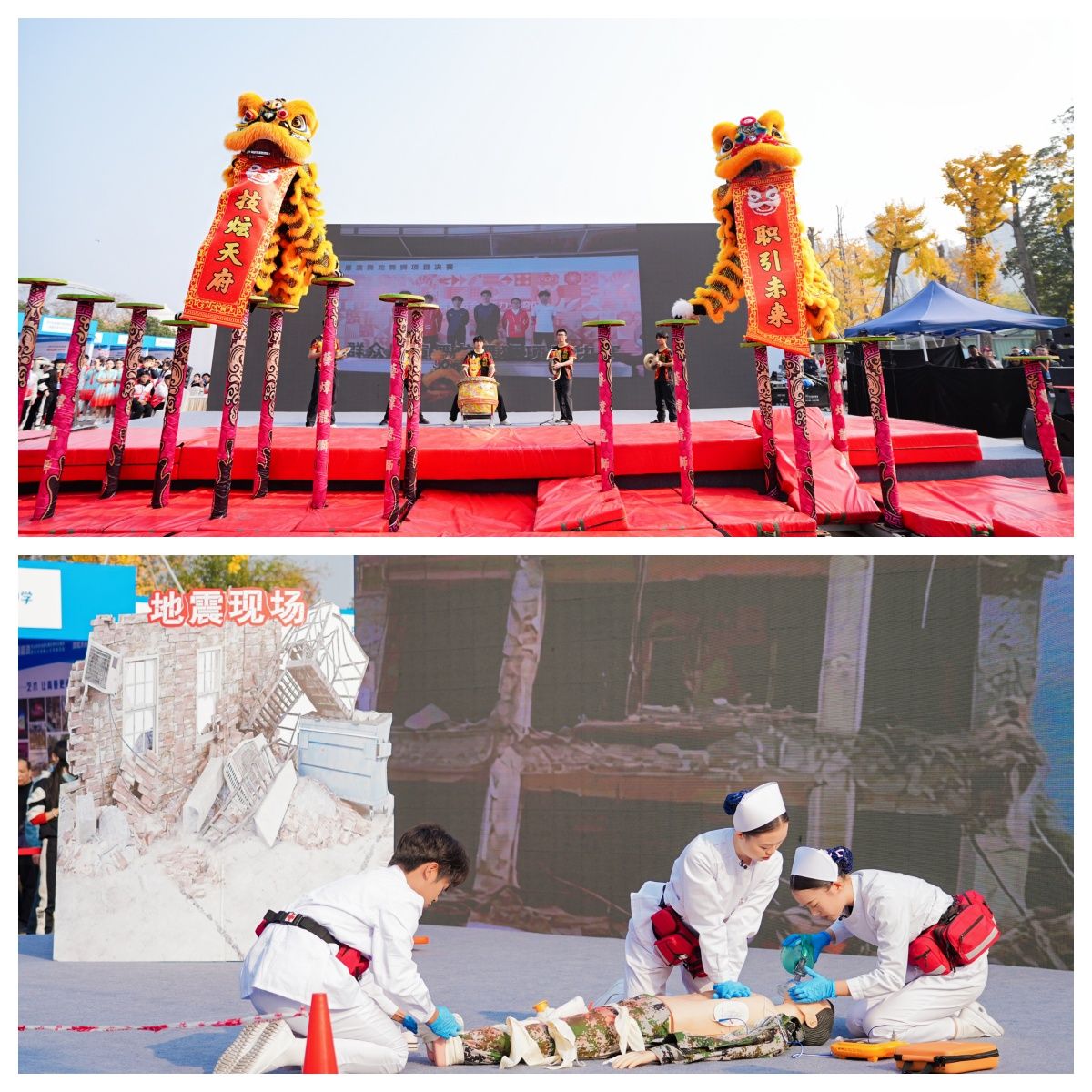 在舞台表演环节,我校选送的两个节目成为活动亮点。开场节目《醒狮送福》以非遗技艺融合时代精神,以灵动雄健的表演点燃全场,传递出职业教育蓬勃发展的生机与活力;紧随其后的应急救护项目《灾难现场救护》,通过高度仿真的情景演练,展示学生娴熟的专业技能与沉着冷静的职业素养,赢得现场观众一致好评与热烈掌声。