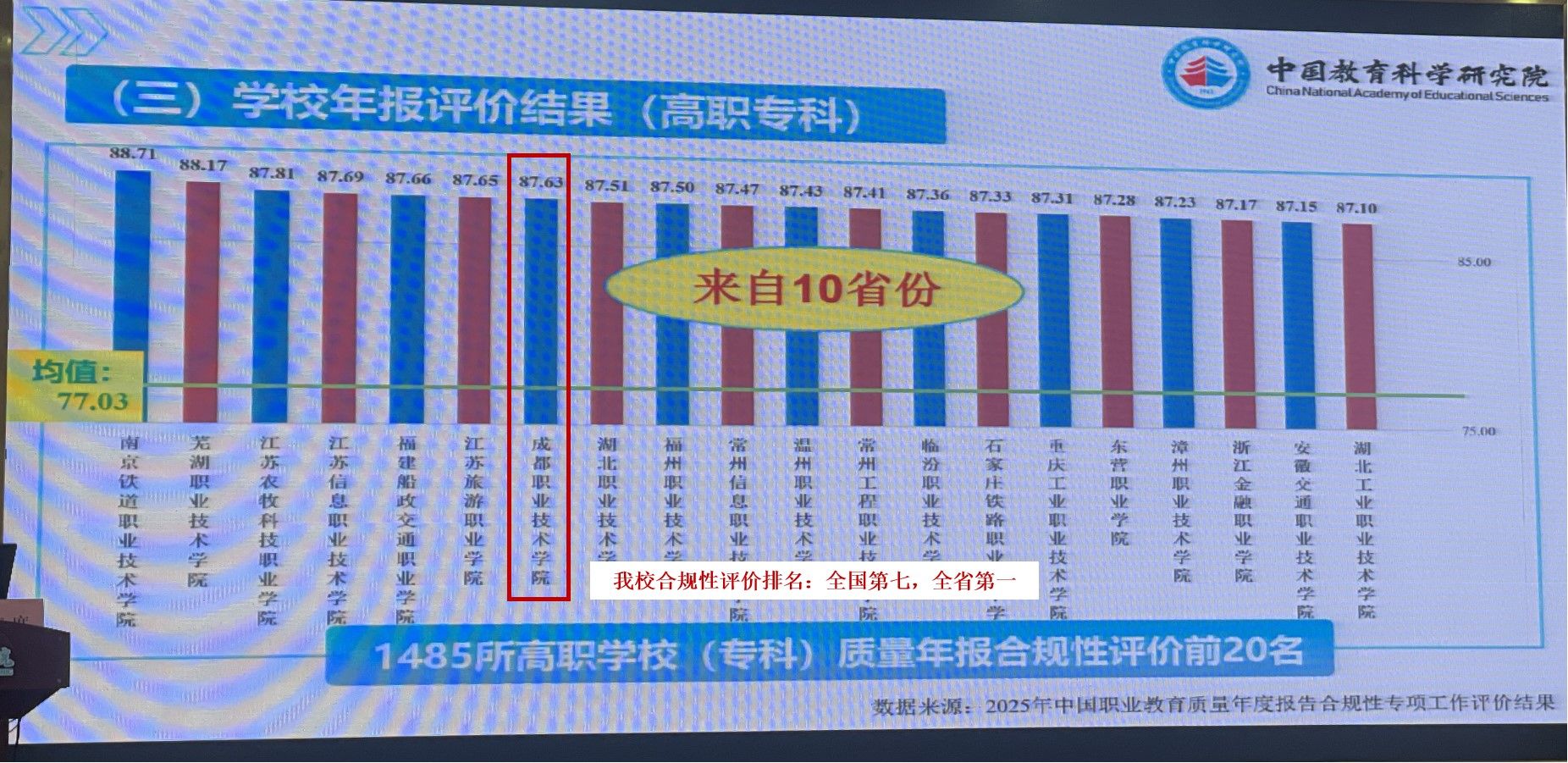 会上,同步发布了省级层面职业教育质量报告和中高本各层次报告的评价结果。我校2024年质量报告在全国1485所高职学校(专科)质量年报合规性评价排名全国第七、全省第一。