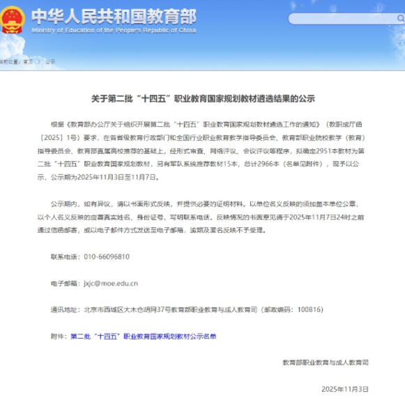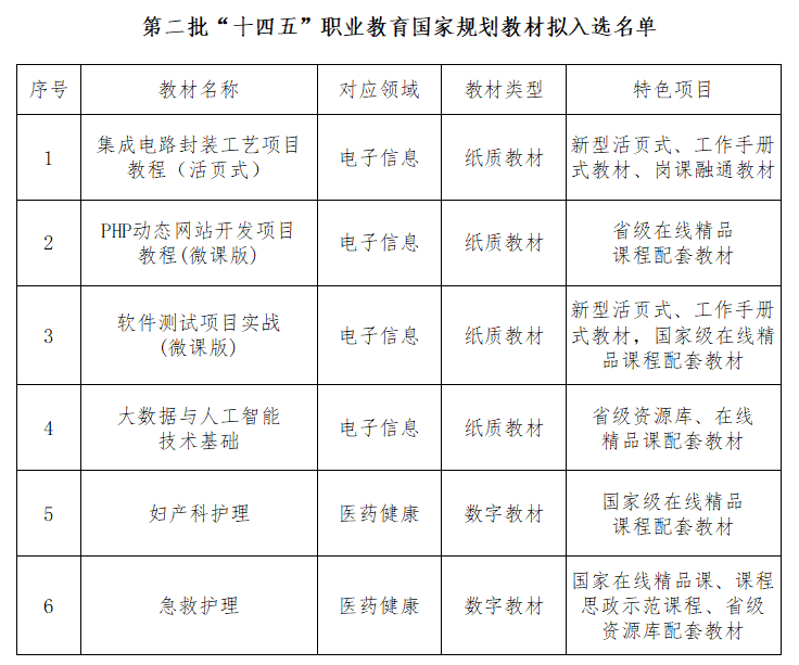 近日,教育部发布了第二批“十四五”职业教育国家规划教材遴选结果名单,我校共有6部教材成功入选,入选数量位居全省第三。
