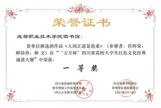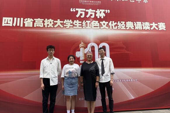 为庆祝中国共产党百年华诞,弘扬并传承红色经典文化,以“铸魂百年辉煌传承红色华章”为主题的“万方杯”四川省高校大学生红色文化经典诵读大赛决赛6月18日下午在四川大学落下帷幕。经过校内选拔,省上专家委员会初审,我院参赛作品《人间正道是沧桑》在全省64所高校提交的164件作品中脱颖而出顺利入围决赛,并最终荣获一等奖。同时,该作品也被学习强国成都学习平台选用、展播。