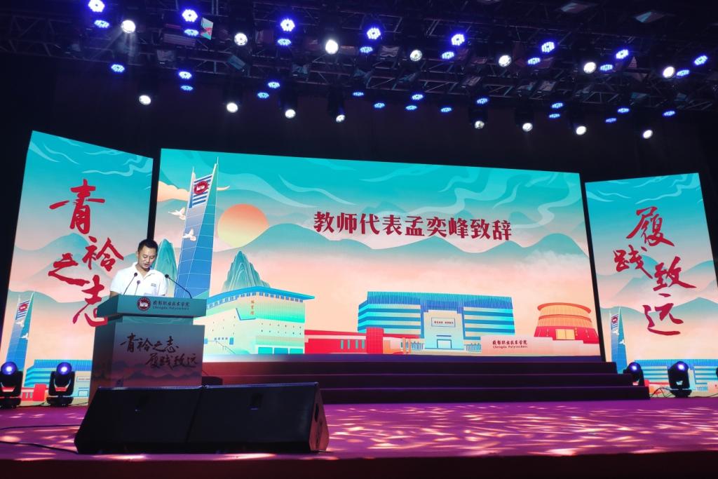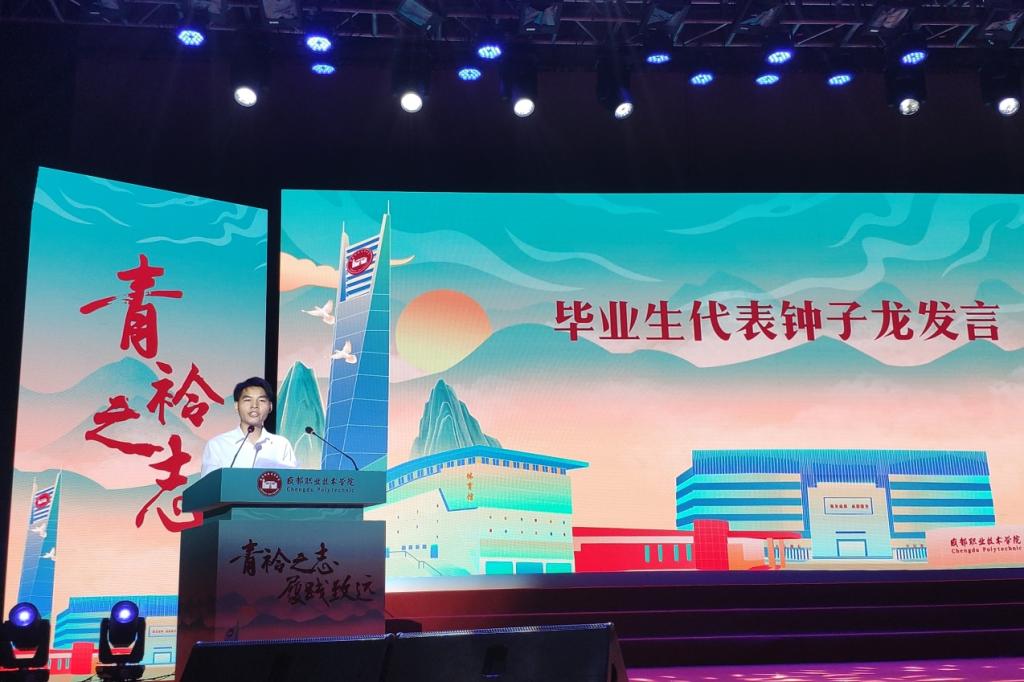 优秀毕业生代表钟子龙回首了难忘的三年成职时光,并代表2021届毕业生表达了对学校和老师的感激之情。教师代表、光伏发电技术专业主任孟奕峰代表全体老师表达了对毕业学子美好的期望和祝福。各位领导分别为四川省优秀毕业生、学校优秀毕业生代表颁发了荣誉证书。