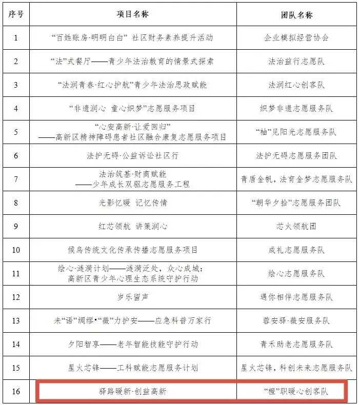 附件:“星火创益·学子有志”成都高新区高校志愿服务创客大赛支持落地项目名单