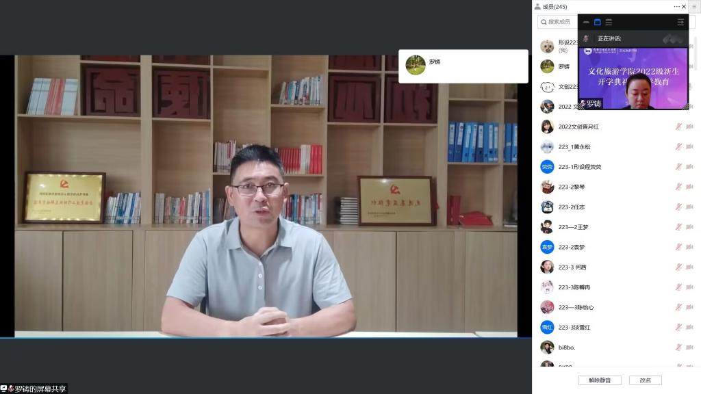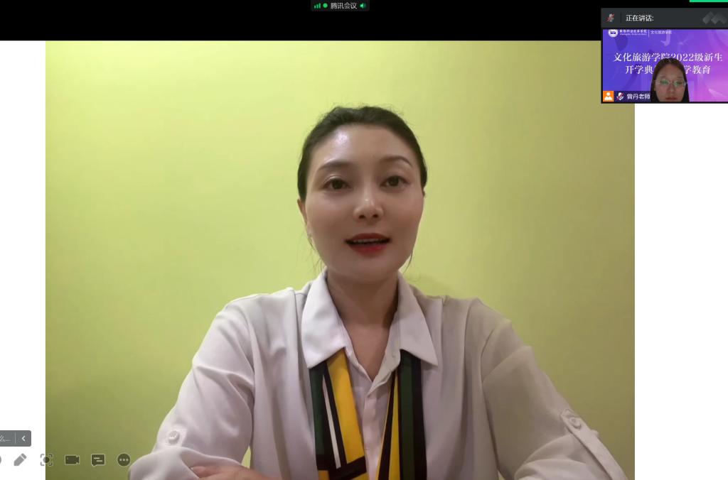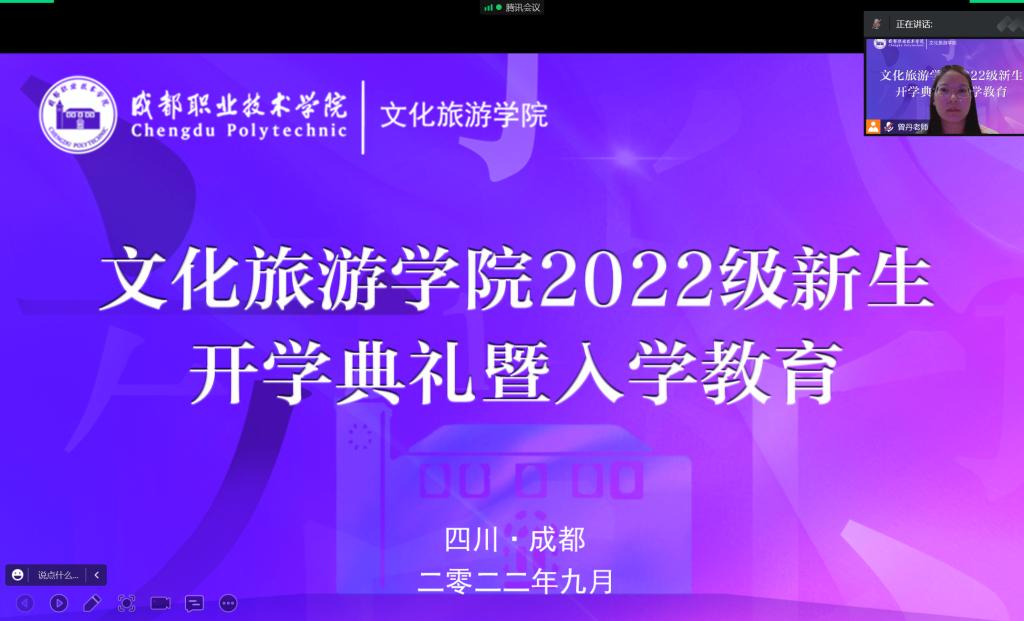 2022年9月15日9点,成都职业技术学院文化旅游学院采取云上开学的形式隆重举行了2022级新生开学典礼暨入学教育。此次开学典礼利用腾讯会议设立五个分会场,由各2022级新生辅导员老师主持,文化旅游学院党总支书记、院长洪光英、党总支副书记吴学伟、副院长黄晓菲、综合办公室主任舒莉、教学办公室主任吴雪、学工办主任赵琪以视频方式出席会议。参加此次会议的还有分院学生工作各专项负责教师、2020级学生代表及2022级全体新生。