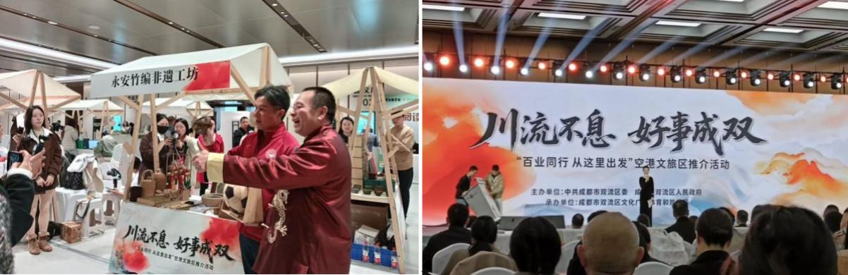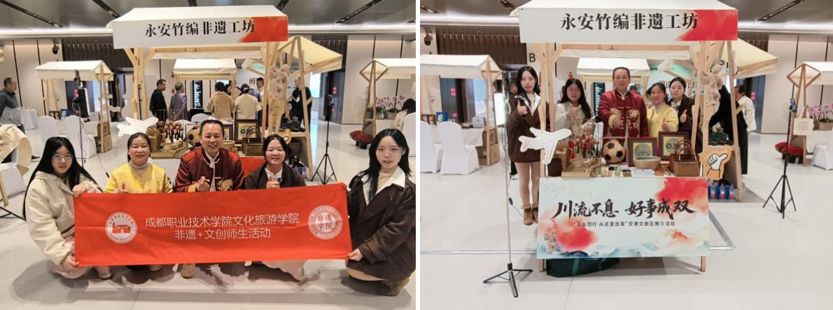 2025年11月12日,在“空港文旅区推介活动”中,文创专业师生再次展现专业服务能力。在干曦礼、罗锋、王晓莹等教师的指导下,由“造物社”学生社团成员及文创233-1班学生组成的服务团队,为国家级青神竹编传承人郭志爱大师所在的四川慈竹岭文化创意有限公司提供了全程参展支持。学生将《文化项目统筹》课程知识运用于展品布置与观众引导,同时借助《新媒体运营》所学,通过直播讲解竹编技艺与文创产品故事,有效提升了青神竹编的品牌传播力与影响力。