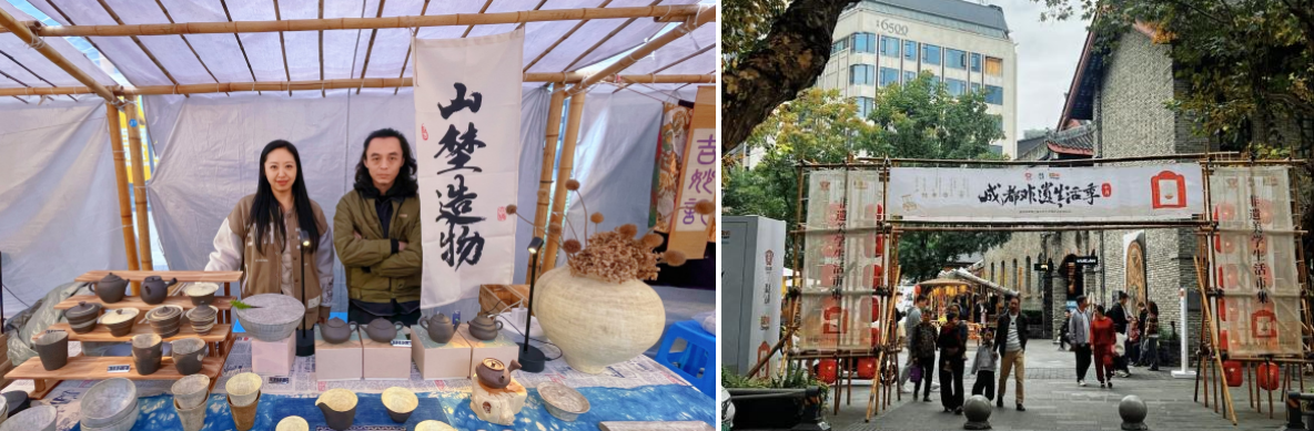 2025年11月11日至16日举办的“成都非遗生活季”市集活动中,文创专业教师干曦礼带领学生团队,与国家级荥经砂器烧造技艺传承人曾庆红、张福斌所在的荥经县曾氏庆红砂器有限责任公司深度合作,为其量身策划并搭建展位,提供包括技艺讲解、产品推介与现场引导等一体化服务。该实践项目将作为典型教学案例,融入《文化项目统筹》《非遗文创衍生设计》等课程,实现“从实践反哺教学”的良性循环。