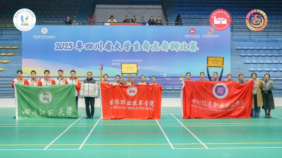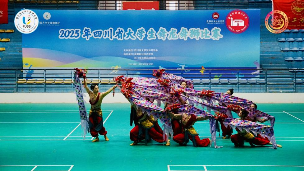 2025年11月29日至30日,由四川省大学生体育协会主办、我校承办的2025年四川省大学生舞龙舞狮比赛在花源校区圆满落幕。文化旅游学院(成都非遗学院)文化创意与策划专业2024级刘晶晶、杨青亭、周念佳、幸佳瑞四位同学,在通识教育学院王浩老师的指导下,凭借彩带龙作品《丝路》荣获彩带龙自选套路项目第一名。此次佳绩不仅展现了同学们扎实的专业能力,也体现了我校“五育并举”育人理念与文创专业“文化转化+非遗传承+创意赋能”办学模式的积极成效。