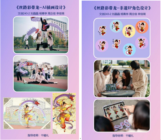在文创专业主任干曦礼老师的引导下,获奖团队并未止步于赛场,而是依托成都非遗学院文创转化实训平台,将《丝路》表演中的敦煌“飞天纹样”“龙身动态”等元素提取为设计素材,陆续完成《丝路彩带龙-非遗IP角色设计》《丝路彩带龙-AI插画设计》等衍生作品。同学们表示,希望通过文创实践让彩带龙“活”起来,使其不仅是竞技项目,更能以产品、课程等形式融入日常生活,传递非遗与创意融合的魅力。