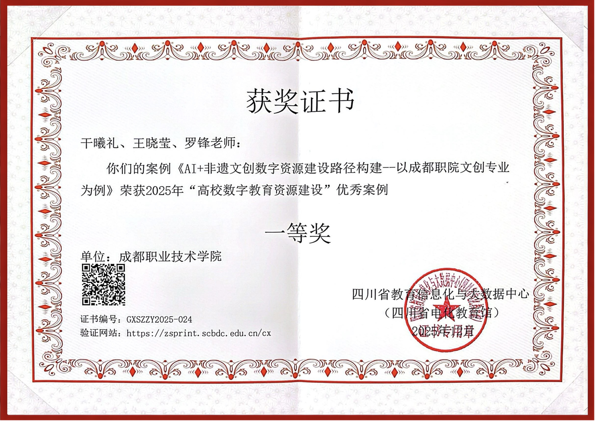 会上,成都职业技术学院文化旅游学院(成都非遗学院)文创专业干曦礼、王晓莹、罗锋老师团队提交的案例《AI+非遗文创数字资源建设路径构建——以成都职院文创专业为例》,荣获“高校数字教育资源建设”优秀案例一等奖,并受邀在年会中进行展示。