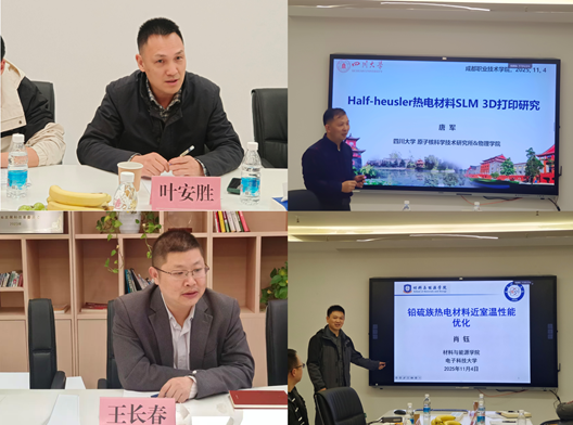 本次研讨会邀请了四川省增材制造技术协会王长春秘书长、四川大学唐军教授、电子科技大学肖钰研究员、通威太阳能有限公司苏荣教授以及四川省增材制造技术协会执行秘书长唐志勇等学界与业界专家。研讨会聚焦国际前沿的热电材料与增材制造技术。会上,四川大学唐军教授作了题为《Half-Heusler热电材料SLM 3D打印研究》的专题报告,深入分享了利用选区激光熔化(SLM)技术制备高性能Half-Heusler热电材料方面的最新研究进展,为热电器件的制造提供了新思路。随后,电子科技大学肖钰研究员带来了《铅硫族热电材料近室温性能优化》的研究报告。报告系统阐述了团队提升铅硫族热电材料近室温区转换效率的关键技术策略及成果,该项研究对于拓展热电技术在低品位废热回收、局部制冷等领域的应用具有重要价值。在交流环节,与会专家与工程中心教师就报告内容、技术难点、未来合作方向等进行了热烈讨论。