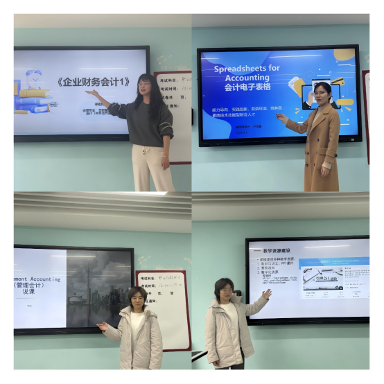 在说课展示环节,专业全体教师逐一登台,围绕所授课程进行了精彩的说课展示。教师们结合大数据与会计专业的国际化特色,从课程定位、教学目标、教学设计、教学实施、教学反思等方面进行了系统阐述。有的教师重点展示了双语教学的设计思路,有的教师分享了案例教学与项目化教学的实践经验,充分体现了中英教学团队在课程融合、教学方法创新方面的积极探索。