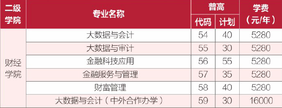 财经学院今年招收普通高中学生共生230人(大数据与会计、大数据与审计、金融科技应用、金融服务与管理、财富管理、大数据与会计中外合作办学共6个专业),欢迎大家踊跃报考。