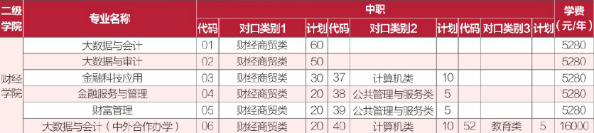 财经学院今年招收财会金融对口中职学生200人(大数据与会计、大数据与审计、金融科技应用、金融服务与管理、财富管理、大数据与会计中外合作办学共6个专业)。