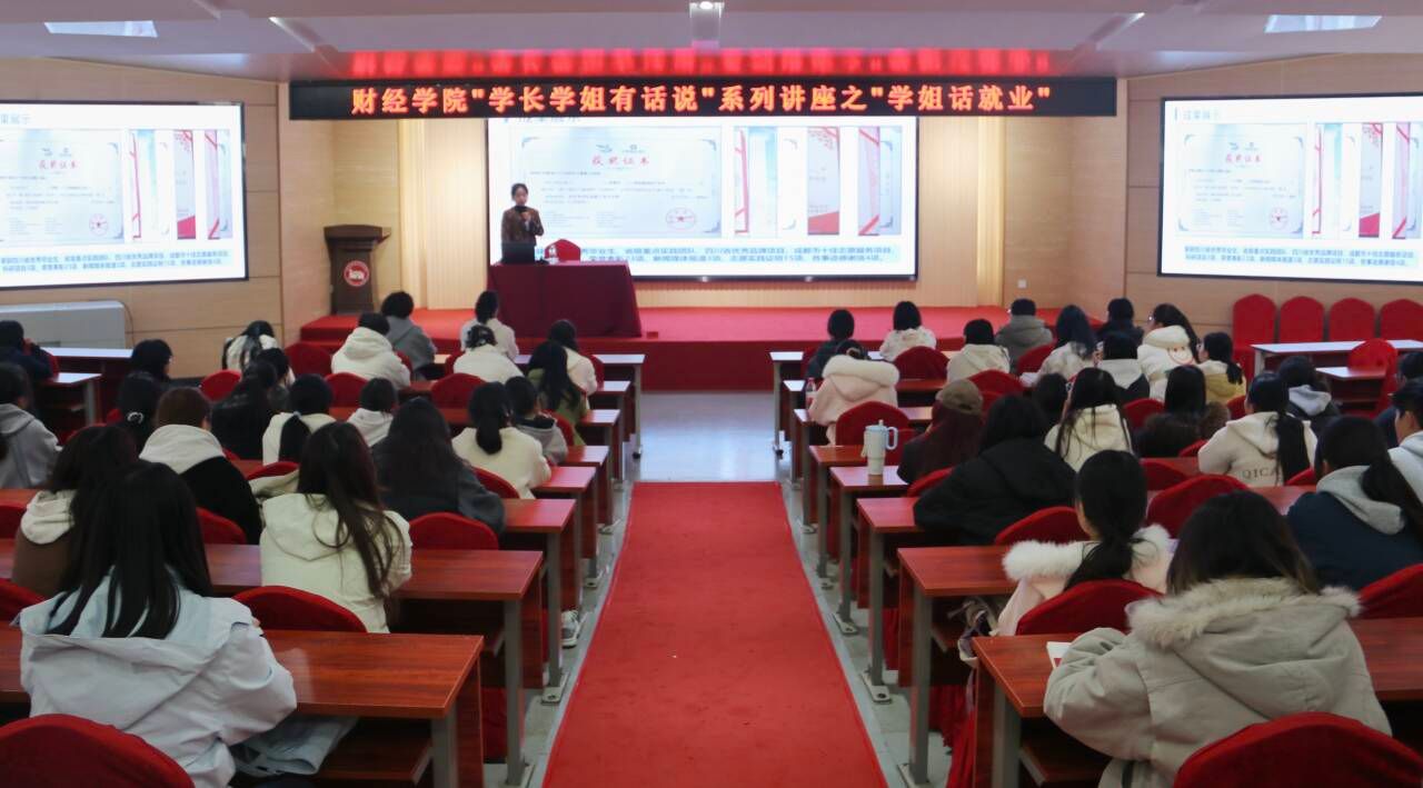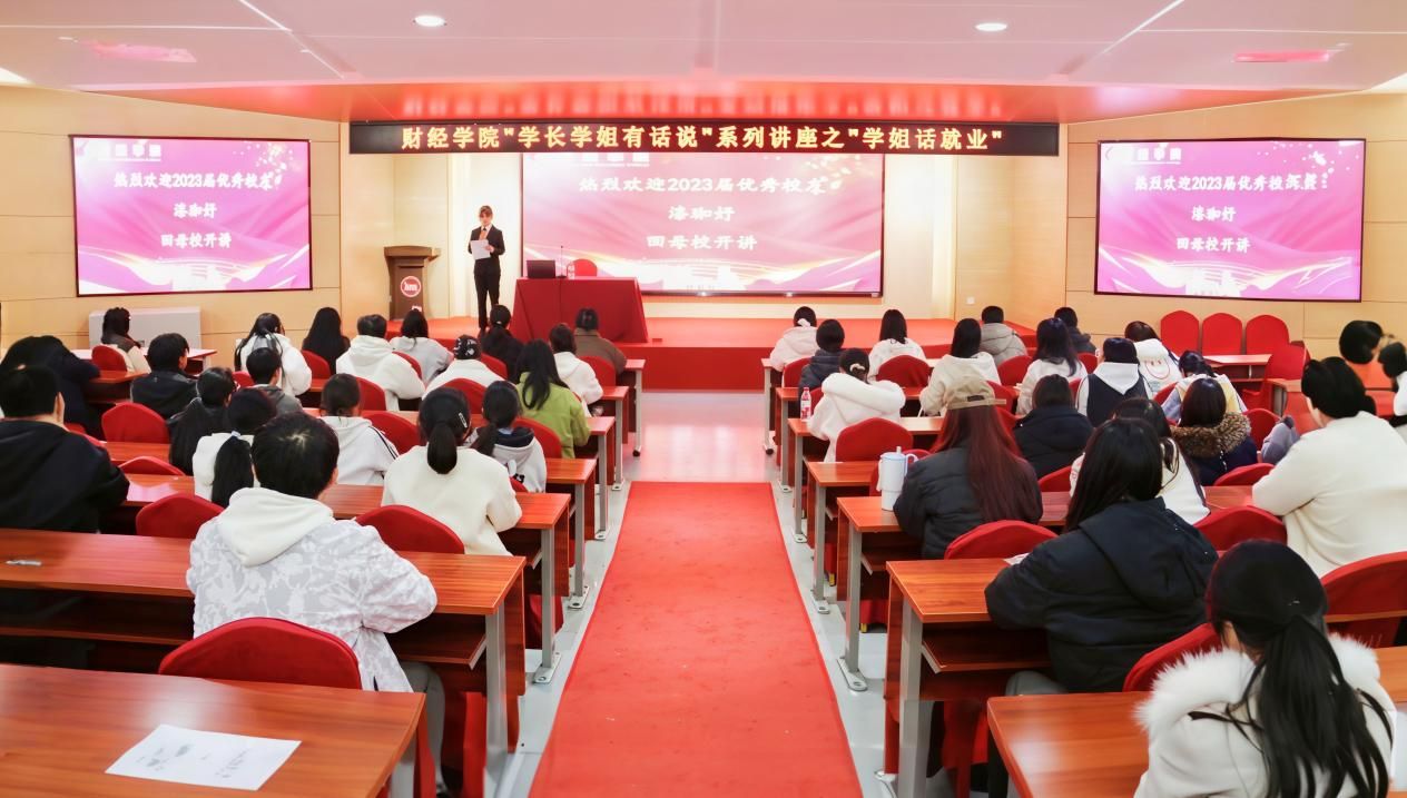 为发挥优秀校友的榜样引领作用,帮助同学们明确学业规划、明晰就业方向,财经学院于2025年11月24日在财经学院学术报告厅开展“学姐话就业”分享会,特邀2023届优秀毕业生代表漆珈妤回母校开讲。