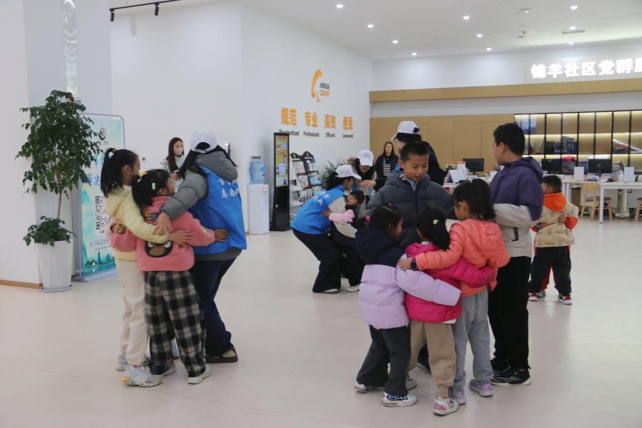 活动伊始,志愿者们身着统一蓝马甲,以暖场破冰环节快速活跃现场氛围。志愿者引导小朋友依次进行自我介绍,帮助孩子们消除陌生感,在互动中快速拉近彼此距离。随后开展“红灯停绿灯行”“数字抱团”趣味游戏,孩子们跟随指令舒展身体、快速抱团,在互动中增进彼此亲近感与团队协作意识,现场秩序井然、氛围热烈。