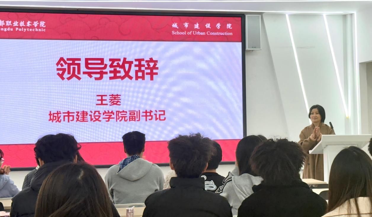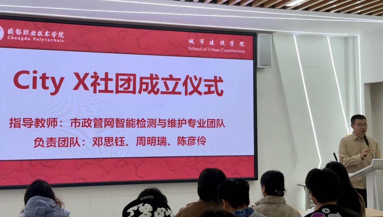 2025年12月19日上午,第十二届中国(成都)国际管网展览会市政管网智能检测与维护专业认知调研活动成果分享暨City X学生社团成立仪式在城建大楼GA203顺利举行。城市建设学院副书记王菱、副院长杨敏,专业老师陶媛媛教授、王云天博士,辅导员赵明玲老师,以及市政管网智能检测与维护专业2025级全体学生参加了此次活动。
