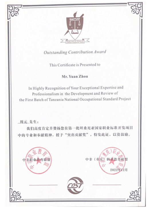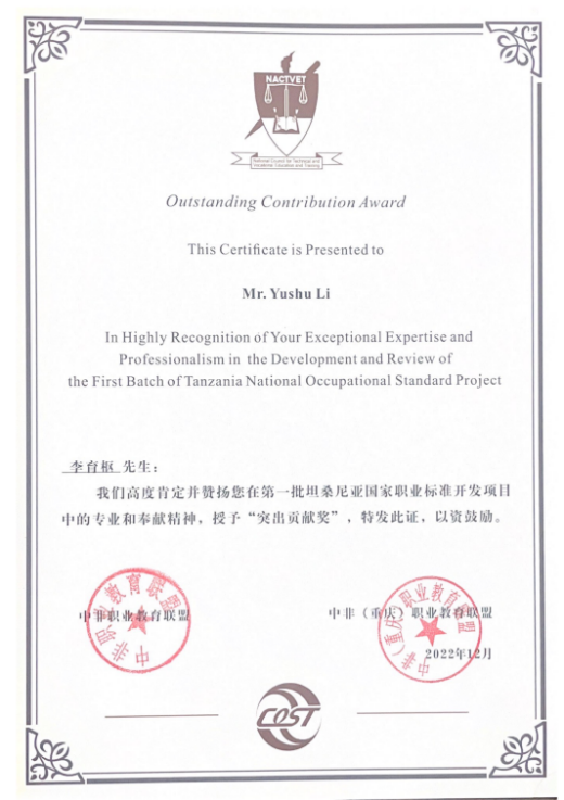 该项目是中国首次大规模整装批量式直接为一个非洲国家开发和修订职业标准,对我国职业教育的国际化发展有里程碑意义。项目将为坦桑尼亚建立新的教育标准奠定基础,在促进坦桑职业教育和培训发展的同时,也有助于培养大量人才和技术工人,进一步提高坦桑尼亚工业化水平。在此基础上,将掀开坦中职业教育合作的新篇章,推动中国职业标准进入坦桑尼亚,为延续坦中友谊做出贡献。该奖项的获得是我院积极参与国际专业、课程、教学职业标准制定,实现标准对外输出,推动我国职业教育标准“走出去”,提升我国职业教育的国际影响力而作出的有力实践!
