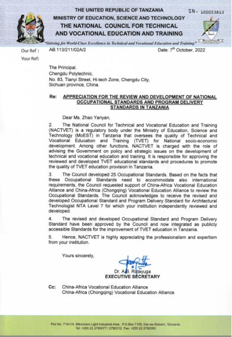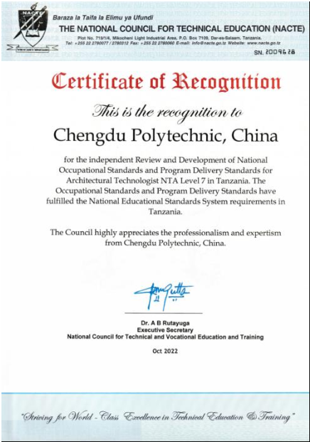 该项目于2022年6月15日,在坦桑尼亚国家职业教育委员会、中非职业教育联盟的联合组织下启动,共有43所中国职业院校参与制定54个岗位职业标准和配套专业教学标准。在学校各级领导的高度重视,各部门的紧密配合下,我院承担了“建筑工艺师7级”、“土木工程技术员5级”2个标准的建设任务,并顺利完成。其中,“建筑工艺师7级”职业标准及配套专业教学标准,于2022年10月7日,顺利通过委员会审核,作为首个获得官方认证的标准,正式纳入坦桑尼亚职业教育体系!