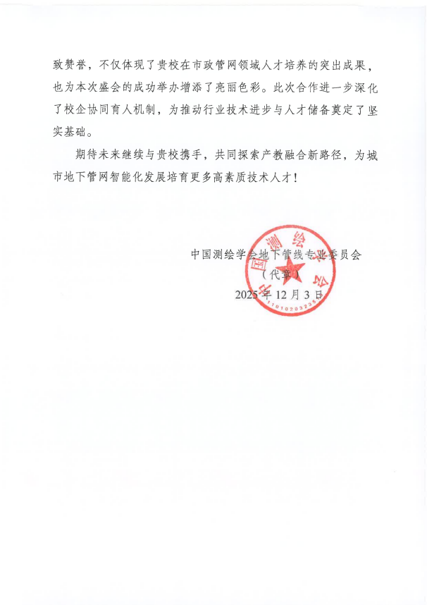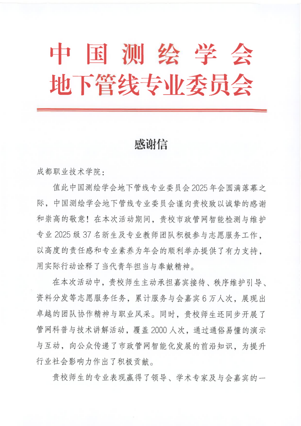 中国测绘学会地下管线专业委员会向我院发来感谢信 近日,中国测绘学会地下管线专业委员会向我院发来感谢信,对我院市政管网智能检测与维护专业2025级37名新生及专业教师团队在中国测绘学会地下管线专业委员会2025年会暨第十二届中国(成都)国际管网展览会期间提供的志愿服务工作表示衷心感谢和高度赞扬。 在本次活动期间,我院市政管网智能检测与维护专业师生团队以高度的责任感和专业素养,积极参与志愿服务工作,为年会的顺利举办提供了有力支持,累计服务与会嘉宾6万余人次,展现出卓越的团队协作精神与职业风采。同时,师生们还同步开展了管网科普与技术讲解活动,覆盖2000余人次,通过通俗易懂的演示与互动,向公众传递了市政管网智能化发展的前沿知识,为提升行业社会影响力作出了积极贡献。 此次志愿服务工作是我院深化产教融合、校企合作的又一成功实践。未来,我院将继续加强与行业龙头企业、专业学会的合作,探索产教融合新路径,为城市地下管网智能化发展培育更多高素质技术人才,为推动行业高质量发展贡献智慧和力量。