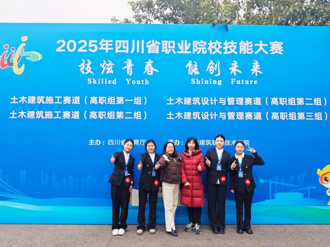 近日,2025 年四川省职业院校技能大赛“土木建筑设计与管理”赛道第 2 组赛事在四川建筑职业技术学院圆满落幕。由我校工程造价专业学生陈炳圻、杨曦、王鳐霏、杨彬垚组成的参赛团队,在乔丹、杨燕两位老师专业细致的指导下,凭借扎实的专业功底与创新的技术应用,从全省多所高职院校的24支参赛队伍中脱颖而出,以总排名第三的优异成绩斩获银奖,充分展现了我校学子在工程造价数智化领域的专业素养与实践能力。