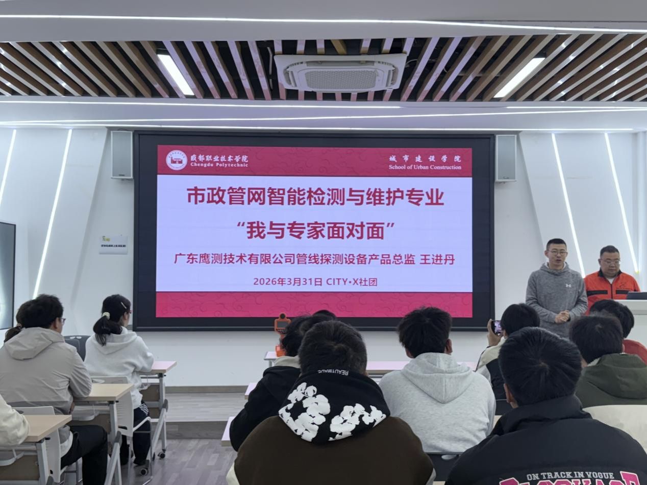 匠心筑梦,产教同行——市政管网智能检测与维护专业成功举办“我与专家面对面”活动 为深化产教融合,推动专业教学与行业需求精准对接,提升学生实践创新能力,3月31日,在学院校企合作办公室统筹协调下,市政管网智能检测与维护专业联合专业社团City X,在学院203会议室及实训基地成功举办了“我与专家面对面”活动。本次活动特邀广东鹰测技术有限公司管线探测设备产品总监、地下管线探测技术专家王进丹莅临,与市政管网智能检测与维护专业带头人陶媛媛教授、专业主任王云天及25级全体学生共同开展专题讲座、技术实操与校企合作研讨,为师生带来一场专业理论与实践深度融合的宝贵经历。 王进丹专家以《地下管线探测技术与应用》为题,结合自身十余年行业经验,通过真实案例与数据分析,向学生们系统讲解了地下管线探测技术的关键环节及应用场景。他强调,随着“城市生命线安全工程”的推进,地下管线智能检测与维护已成为智慧城市建设的重要支撑,行业对掌握电磁感应探测、三维探地雷达、GIS+BIM融合技术等复合型人才的需求持续增长。王专家还就国家政策导向、行业标准及数字化转型趋势进行解读,鼓励同学们夯实专业基础,培养创新思维,把握行业发展机遇。 讲座后,王进丹专家现场演示了鹰测科技自主研发的管线探测设备,并指导学生进行管线定位、信号追踪、管道隐患排查等实操训练。同学们积极互动,通过亲身体验加深了对智能检测技术的理解,现场学习氛围浓厚。参与学生纷纷表示收获颇丰,25级学生代表邓思钰表示:“王总监的分享让我对行业前景充满信心,实操环节让我掌握了先进设备的使用技巧,未来希望能参与更多实战项目。” 本次活动是市政管网智能检测与维护专业践行“校企合作、产教融合”办学理念的重要实践,为专业人才培养与行业需求对接搭建了桥梁。未来,学院将继续以产业前沿为导向,通过专家引智、技术赋能、协同育人等举措,培养更多适应智慧城市发展的技术技能人才,为城市地下管网安全运行贡献成职力量!