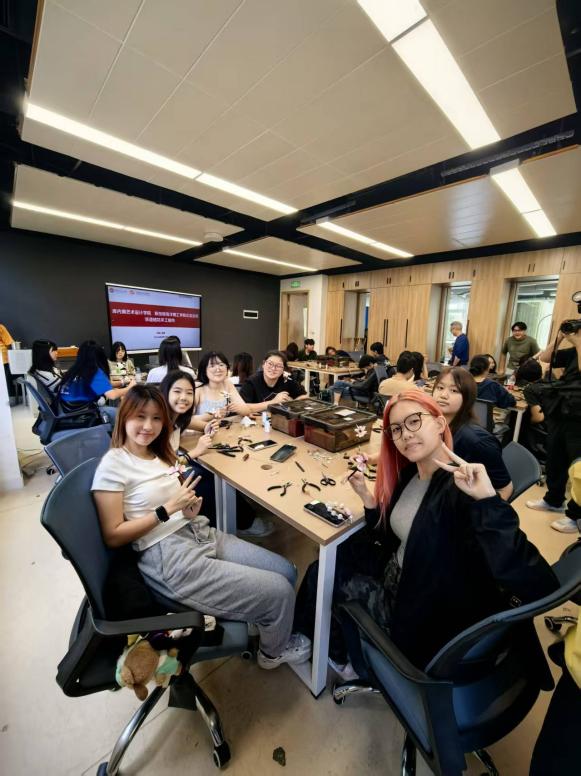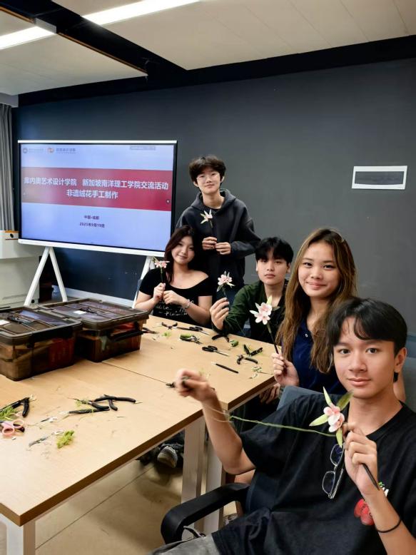 2025年9月19日,创意设计学院人物形象设计专业的同学们在聂巳棚主任带领下,与新加坡南洋理工学院的同学们同上一堂非遗技艺课——绒花制作。