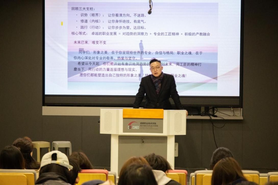 2025年11月4日下午,成都职业技术学院人物形象设计专业特邀国内知名美业专家杨跃武(阿杰)先生,在行政楼102举办题为“塑造形象之美,铸就职业之魂”的专题讲座。