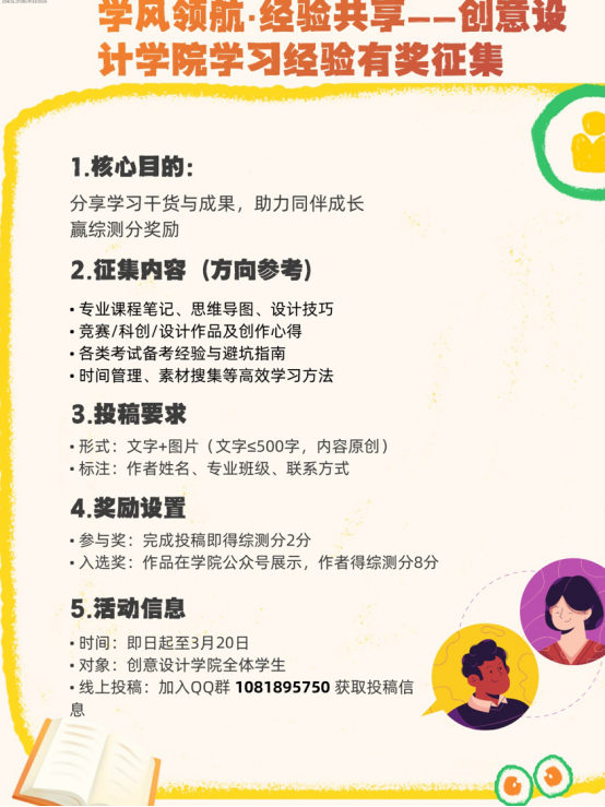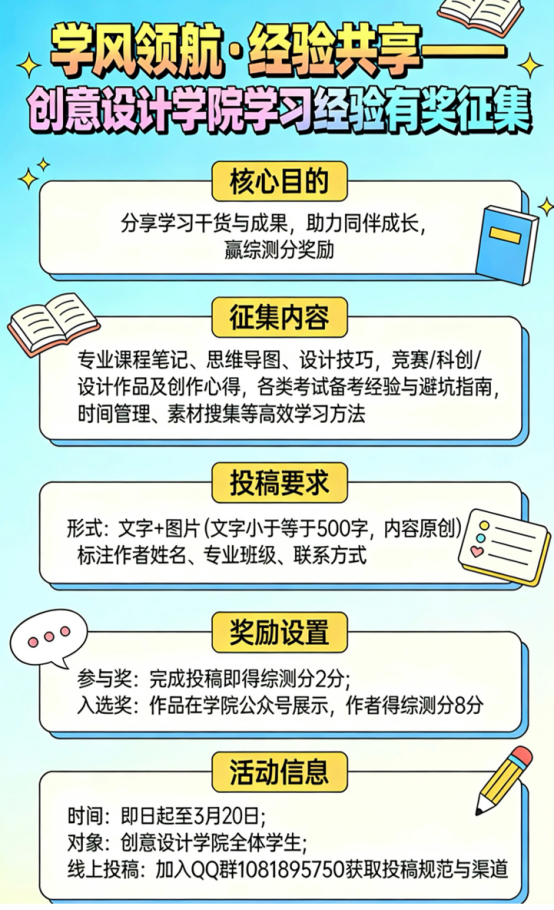 为营造勤学笃行、互帮互助的优良学风,搭建创意设计学院学生之间高效的学习交流平台,现正式启动“学风领航·经验共享”学风建设系列征集活动。诚邀创意设计学院全体学生分享个人学习经验与成果,用实用干货助力同伴成长,同时赢取丰厚综测分奖励。