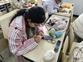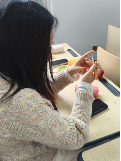活动伊始,指导老师陈老师从钩花的历史渊源讲起,逐一演示起针、锁针、短针、长针等基础针法,帮助零基础参与者快速入门。随后,大家在陈老师的带领下正式投入创作:穿线、绕指、钩针穿梭,柔软的毛线在指尖渐次成型,由零散的线团化作一片片精致的花瓣与叶片。