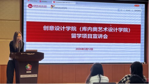 2026年3月12日,成都职业技术学院(创意设计学院)顺利举办库内奥艺术设计学院留学项目专题宣讲会。创意设计学院教学办公室主任彭山山、意大利库内奥美院教授Fabrizio Caputo及驻中方代表何凤老师共同出席,为在场学生系统解读了意大利艺术教育体系、特色留学路径及未来职业发展前景。