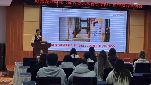 随后, Fabrizio Caputo教授通过生动的讲述,向学生们展示了库内奥美术学院长达156年的悠久办学历史、特色专业方向。他强调,学校教学模式注重产教融合,通过与行业企业的紧密合作,使学生在校期间便能深入接触前沿设计实践,提前融入真实项目环境。Caputo教授指出:“留学经历为同学们提供了宝贵的实习平台,让大家在学习阶段就能进入国际化的行业场景,积累实战经验,为未来的就业与发展打下坚实基础。”