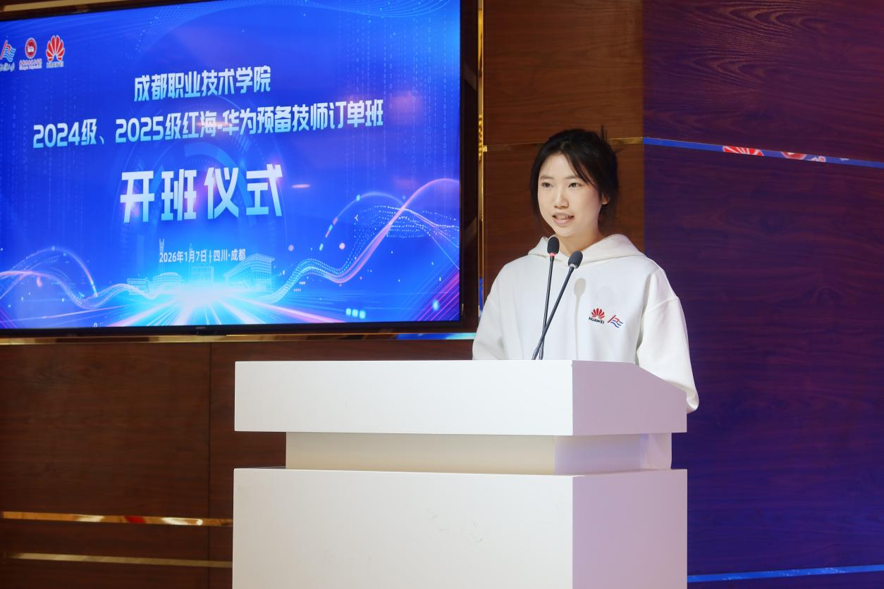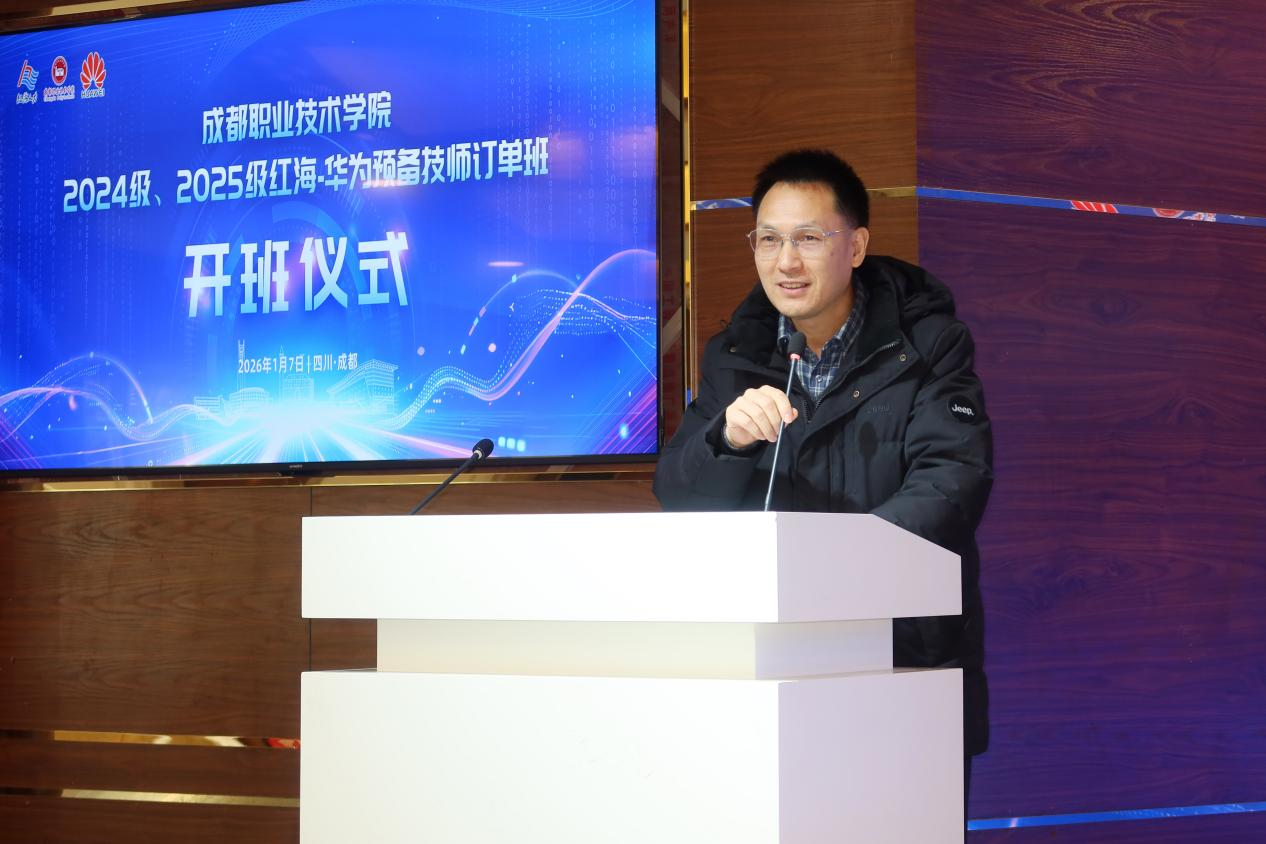 2026年1月7日,成都职业技术学院电子信息工程学院2024级、2025级“红海-华为预备技师订单班”开班仪式在棋艺学院多功能厅隆重举行。学校党委委员、副校长叶安胜,华为机器有限公司人力资源经理赵经理,深圳红海人力资源有限公司总监李鹏出席会议并讲话。招就处、教务处、科研处、学生处等职能部门负责人,电子信息工程学院教师及订单班学生参加开班仪式,会议由电子信息工程学院院长涂智主持。