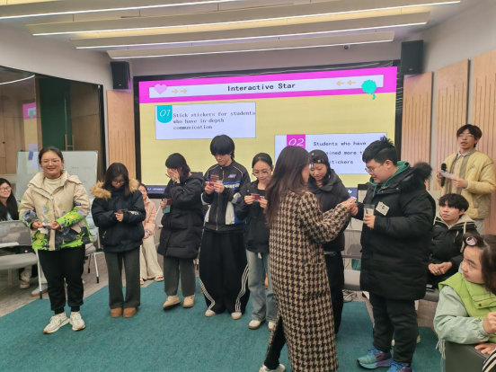 进入自由交流环节后,现场氛围达到高潮,同学们热情高涨地穿梭在人群中,主动与不同角色的同伴攀谈,畅谈对各自角色的理解与喜爱,积极分享独特见解。值得一提的是,诸多平时较为内敛的同学也在活动氛围的感染下大胆突破自我,主动开口用英语交流,顺利融入轻松的互动氛围。现场贴纸不断传递,互动频次持续攀升,英语交流的热情在现场持续升温。