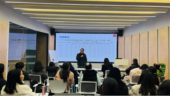 教学办公室主任陈兵就具体操作细节进行说明,并针对老师们提出的问题进行现场答疑。他详细解释了非笔试科目材料归档流程、动态监测点数据填报要求、专家实地考察访谈准备等具体事项,确保各项准备工作落到实处、细处。
