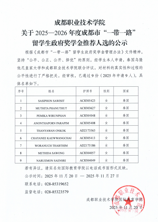成都职业技术学院关于2025—2026年度成都市“一带一路”留学生政府奖学金推荐人选的公示