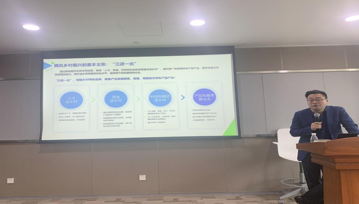 在腾讯云资深架构师王石林博士的热情接待下,参访团一行首先参观了腾讯公司展厅,亲身感受了科技巨头的前沿技术与创新成果。随后,王石林以“新经济、新电商时代下的乡村振兴与智慧农业数字化转型”为主题,为大家带来了一场精彩的讲座,深入剖析了数字经济如何助力乡村振兴,推动智慧农业的发展。