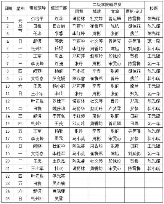 成都职业技术学院花源校区安全值班值守安排表