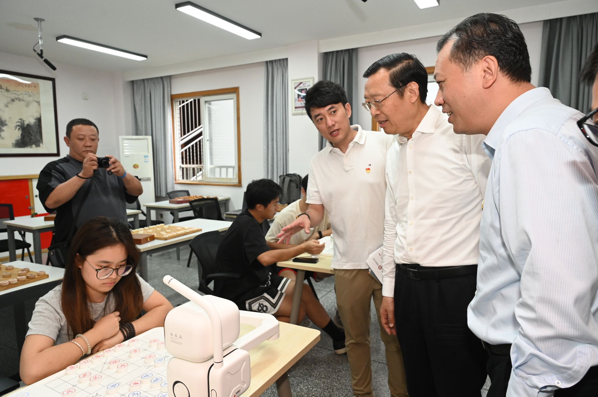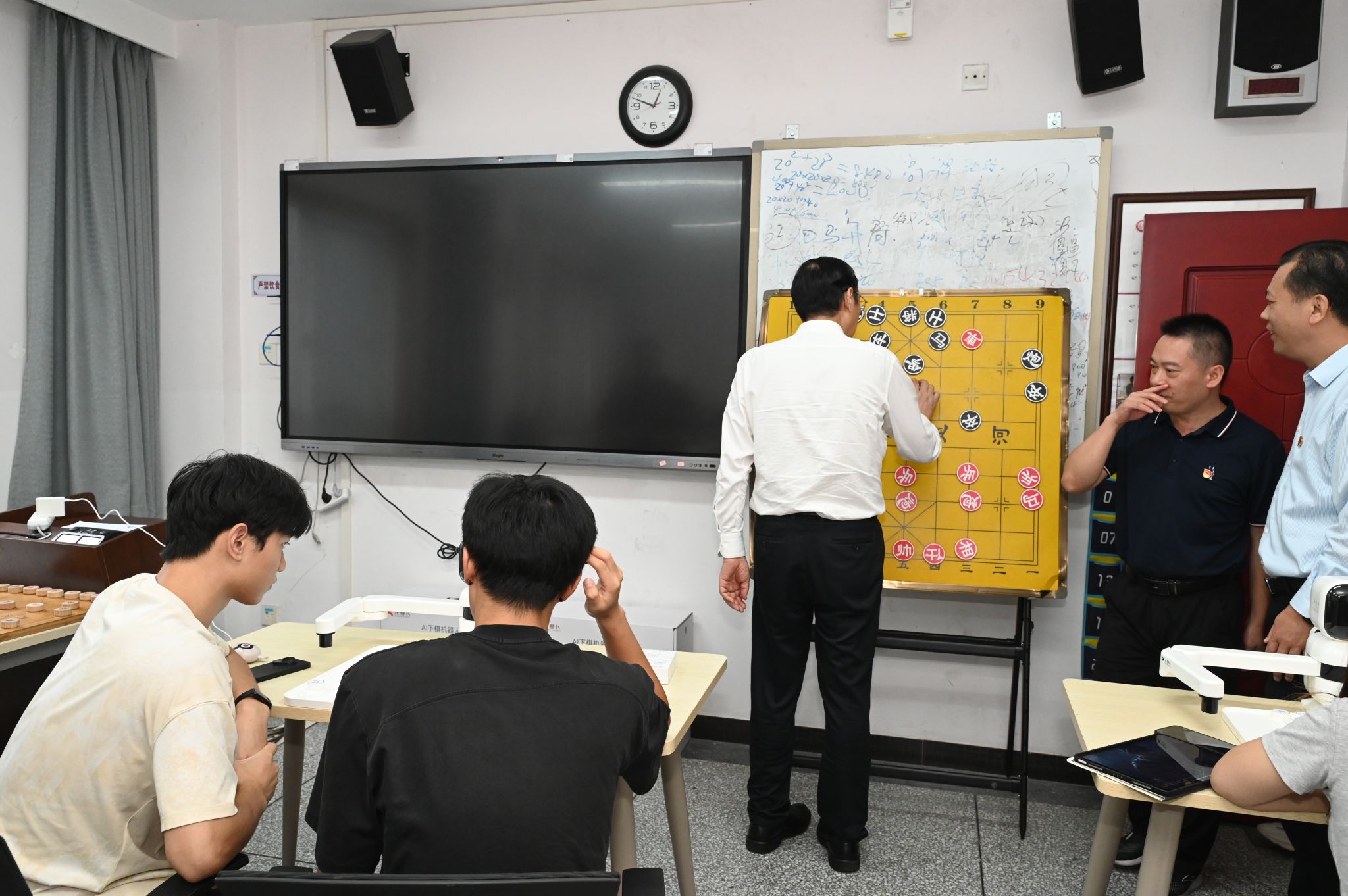 随后,张剡一行实地考察棋艺学院教学环境,先后走访象棋、围棋实训课堂,与师生亲切交流,并对学院引入的AI教学机器人表现出浓厚兴趣。在详细了解人机对弈训练模式后,张剡充分肯定学院在推动棋艺教学智能化方面的探索,并鼓励进一步强化科技赋能,提升教学质量。