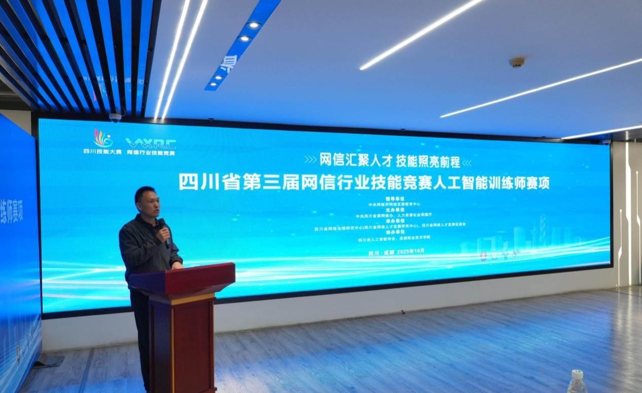 智汇天府,技创未来。10月18日,四川省第三届网信行业技能竞赛——人工智能训练师赛项在我校顺利举行并圆满落幕。本次大赛在中央网信办网信发展教育中心、省委网信办等单位指导下开展,充分体现了各级网信部门对人工智能人才培养的高度重视。开幕式上,学校副校长叶安胜致辞,他简要介绍了学校的建设历程与育人成果,并对参赛选手寄予殷切期望,鼓励大家珍惜竞赛平台,锤炼专业技能,展现新时代技术技能人才的风采。