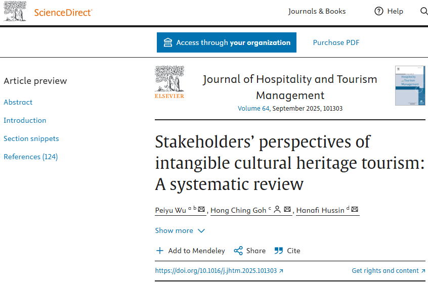 我校国际商贸学院教师、马来亚大学博士研究生吴佩谕老师以第一作者身份,在管理学领域国际权威期刊《Journal of Hospitality and Tourism Management》上发表了题为“Stakeholders’ perspectives of intangible cultural heritage tourism: A systematic review”的高水平研究论文。该期刊隶属于中科院期刊分区(升级版)管理学一区TOP期刊,2024-2025年最新影响因子为7.8,这标志着我校社会科学研究再次取得标志性成果。