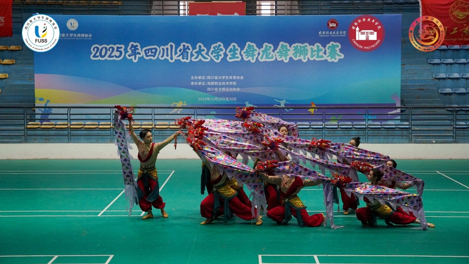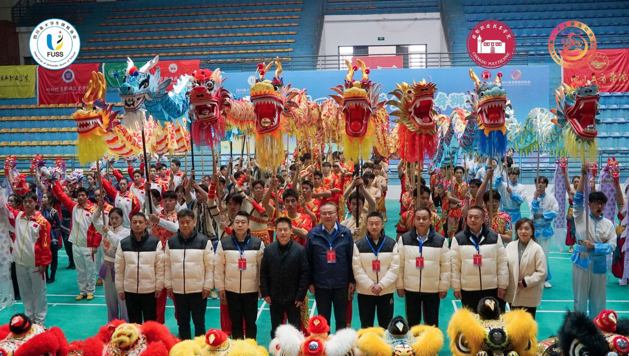 龙腾狮跃展雄风,青春逐梦竞风流。11月30日,2025年四川省大学生舞龙舞狮比赛在我校花源校区体育馆圆满闭幕。本次比赛由四川省大学生体育协会主办,我校承办,吸引了全省18所高校踊跃参与,组建56支参赛队伍,455名领队、教练及运动员齐聚赛场,围绕舞龙、南狮、北狮、彩带龙、创意龙狮5个大项,及舞龙自选、北狮自选、南狮高桩自选等8个小项展开激烈角逐。四川省大学生体育协会副会长毛晓峰,四川省龙狮运动协会会长薛源,我校通识教育学院党总支书记、院长严光玉,副院长杨扬出席开幕式。