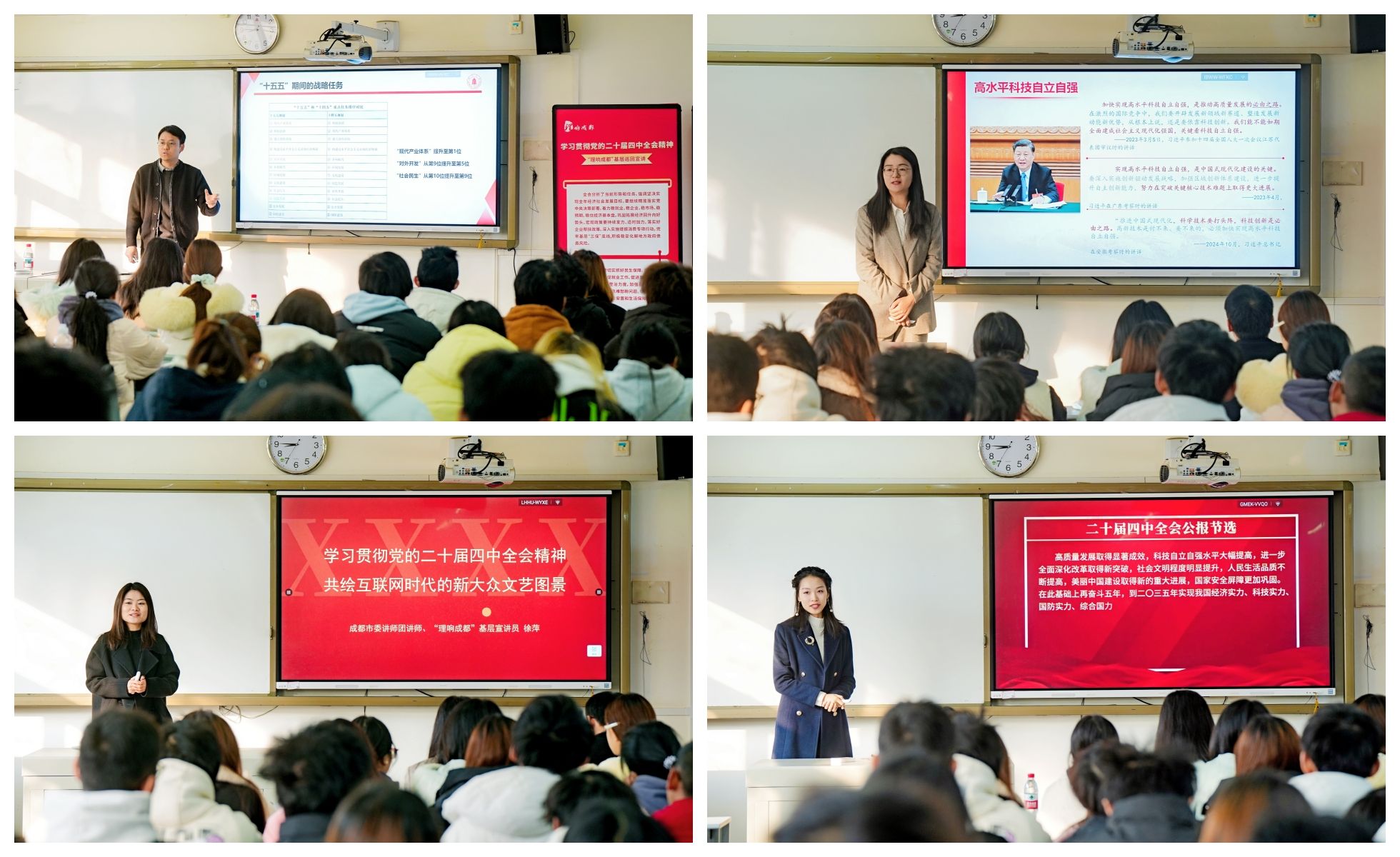 四川大学马克思主义学院助理研究员李源首先从理论层面深刻剖析了全会的核心要义与时代价值;市委党校科技与生态文明教研部讲师张萌结合科技发展与生态文明建设实例,生动解读了高质量发展内涵;成都东部新区高明镇农丰村书记助理刘钰汶同志分享了学习体会与实践感悟,展现了乡村振兴的实践画卷;市委讲师团讲师徐萍老师通过案例分析与现场互动,引导师生深入思考如何以全会精神为引领,在互联网时代打造人民群众喜闻乐见的文艺精品。四位老师的宣讲各有侧重,逻辑清晰,深入浅出,既有理论高度,又贴近实际,赢得了现场师生的阵阵掌声。