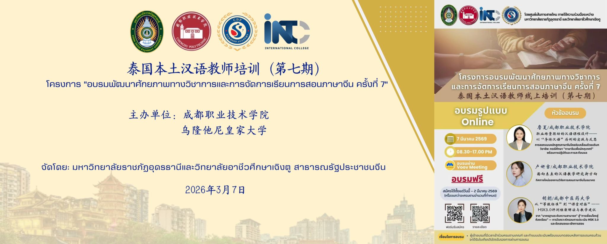 3月7日,由我校与泰国乌隆他尼皇家大学联合举办的第七期泰国本土汉语教师培训圆满落幕,来自泰国各地高校及中小学的120余名汉语教师齐聚线上,共研汉语教学新路径、共探中泰教育合作新方向。学校党委委员、副校长王小军,泰国乌隆他尼皇家大学副校长Phunarat Phiphithkul博士出席培训班开幕式并发表讲话。