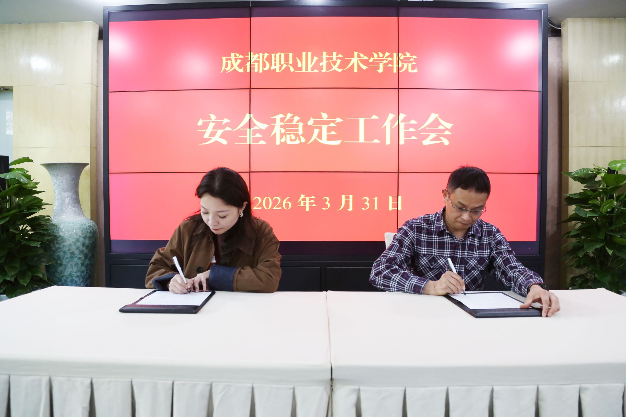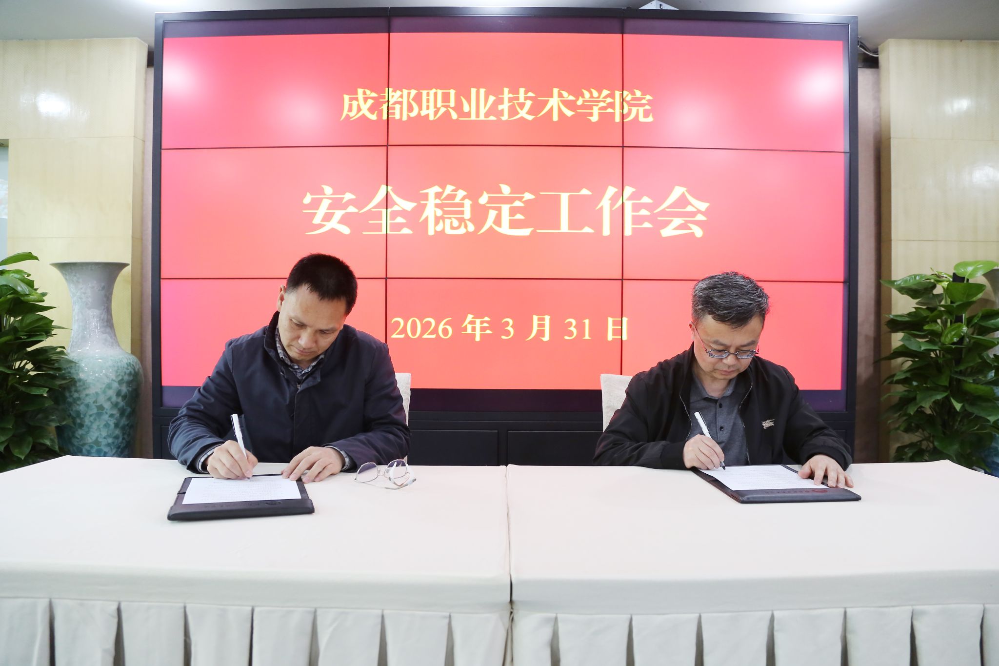 会上集中观看了消防安全警示教育片,叶安胜、邹潇代表校领导分别和分管部门代表签订学校2026年安全目标责任书,保卫处通报了开学以来有关安全工作情况。