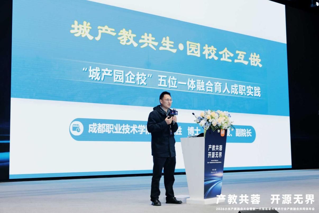 4月11日-12日,2026小米产教融合大会暨新一代智能硬件技术行业产教融合共同体2026年会在成都科幻馆隆重举行。本次大会以“产教共蓉・开源无界”为主题,汇聚政府领导、院士专家、全国百余所院校及百余家企业代表,共商产教融合、校企协同、开源生态与人才培养大计。我校副校长叶安胜受邀参会,并作题为《城产教共生・园校企互嵌“城产园校企”五位一体融合育人成职实践》的主旨报告,系统分享学校产教融合创新模式与典型经验,获得与会嘉宾高度认可。