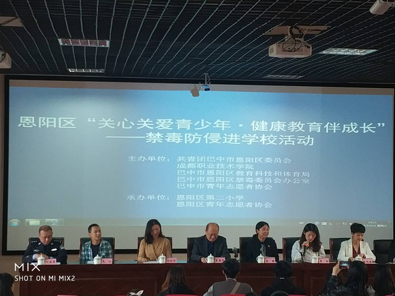 青少年是国家的希望、民族的希望,关心关爱青少年是每一个教育者的责任。12日下午,成职师生来到恩阳区第二小学,联合共青团恩阳区委、区教科体局,区禁毒办、市青年志愿者协会开展了“禁毒防侵进学校”活动,恩阳区委常委、区统战部部长、区总工会主席朱夷平,学院学生处副处长余昕作了发言。活动中,成职师生向恩阳区第二小学的学生赠送了笔袋等文具礼品,并发放了“橙汁儿”共青团自主设计的“防艾禁毒”主题笔记本。同学们还观看了禁毒宣传片,了解了毒品的危害,认识到珍爱生命远离毒品的重要性。