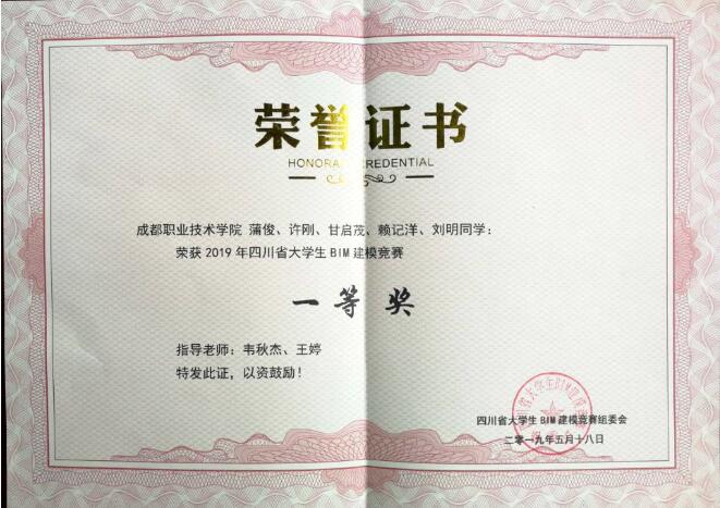5月18日,由四川省教育厅主办的“四川省大学生BIM建模竞赛”在成都工业学院举行。本次大赛吸引了全省35所本专科院校参赛,包括本科院校20所,专科院校15所,其中不乏知名的建筑类院校。我院由建工16级蒲俊、造价17级赖记洋、甘启茂、刘明、许刚5位同学组成的参赛团队,经过历时一个多月的建模、网络提交作品、现场答辩等环节的激烈角逐,沉着应战,力压强敌,喜获本次大赛一等奖,韦秋杰、王婷老师获得“优秀指导教师”。