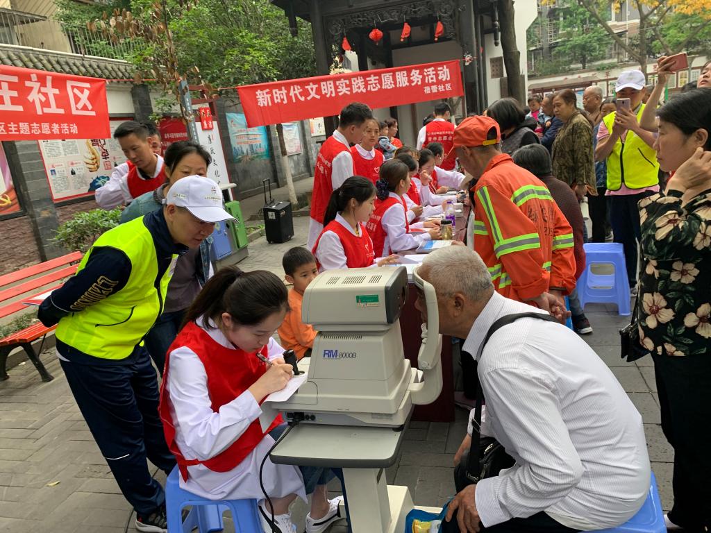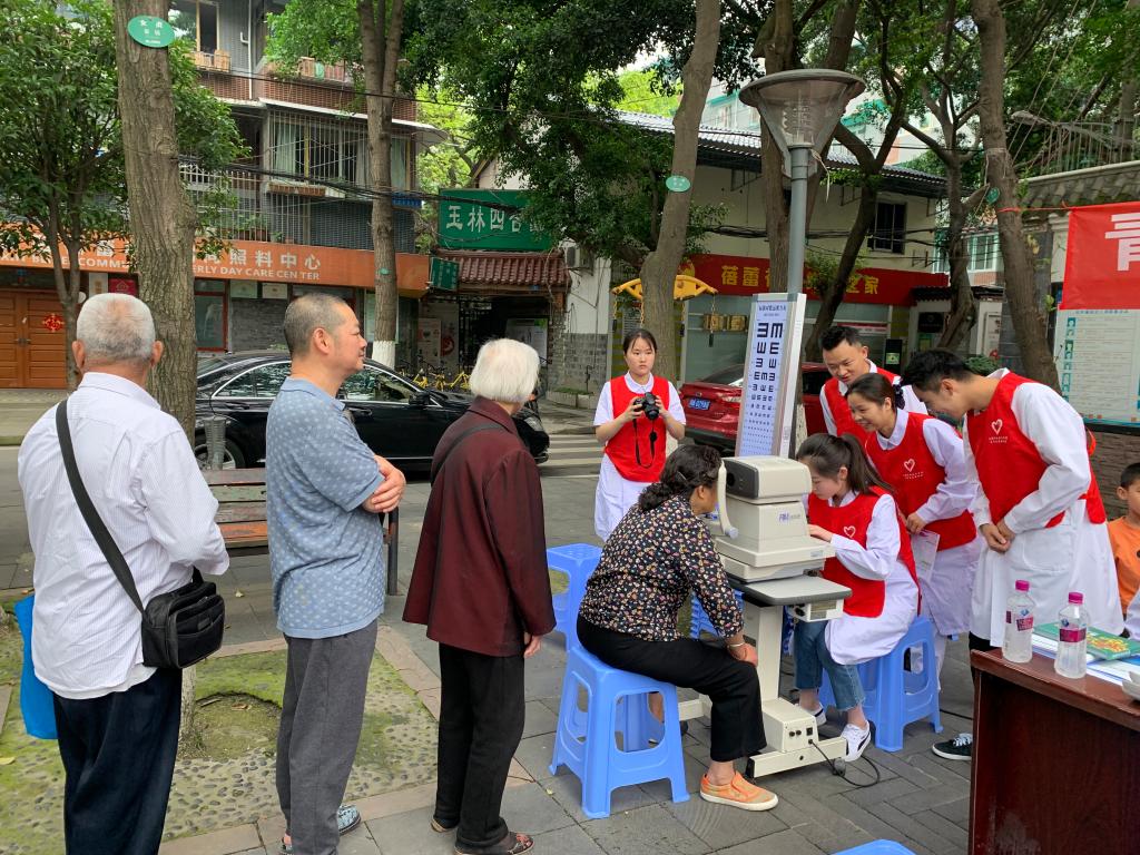 活动中,队员们充分发挥专业特长,热情、耐心、细致地为蓓蕾社区居民提供健康服务。护理专业队员给社区居民进行常规生命体征、血糖、血压等方面的健康检查,把三高、糖尿病等老年常见疾病应该注意的饮食习惯和病情预防控制措施告诉来参加检查活动的老人们。眼视光专业队员给社区老人和小孩进行视力检查,给他们讲解散光、斜弱视、白内障等常见眼疾的就医建议,为家长科普正确的用眼知识。助产专业队员给新生儿家长示范讲解婴幼儿抚触,进行母婴保健知识普及。